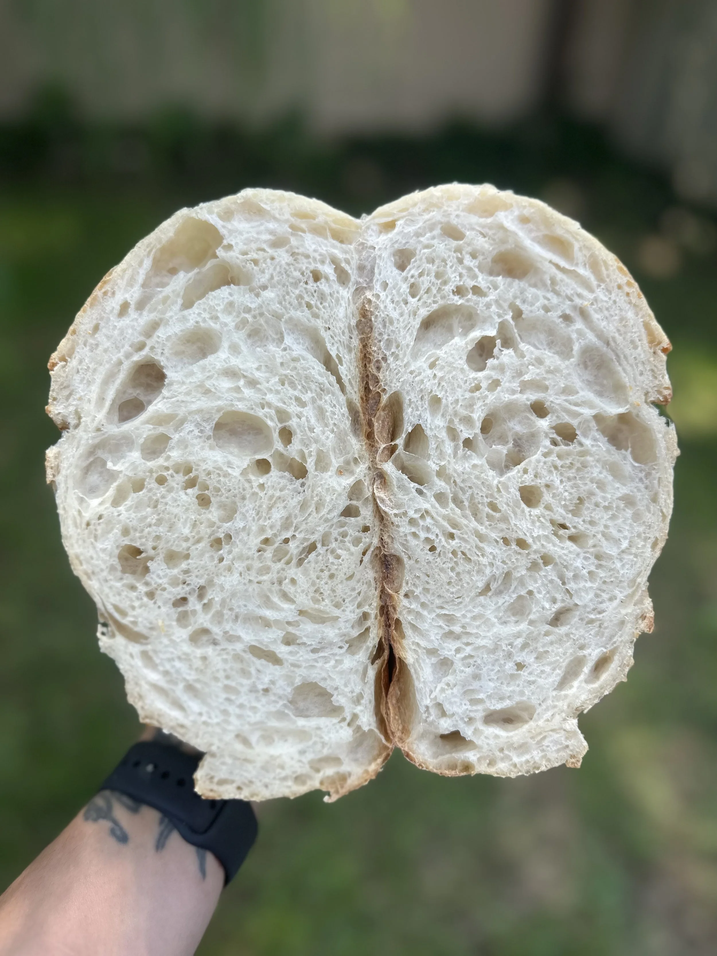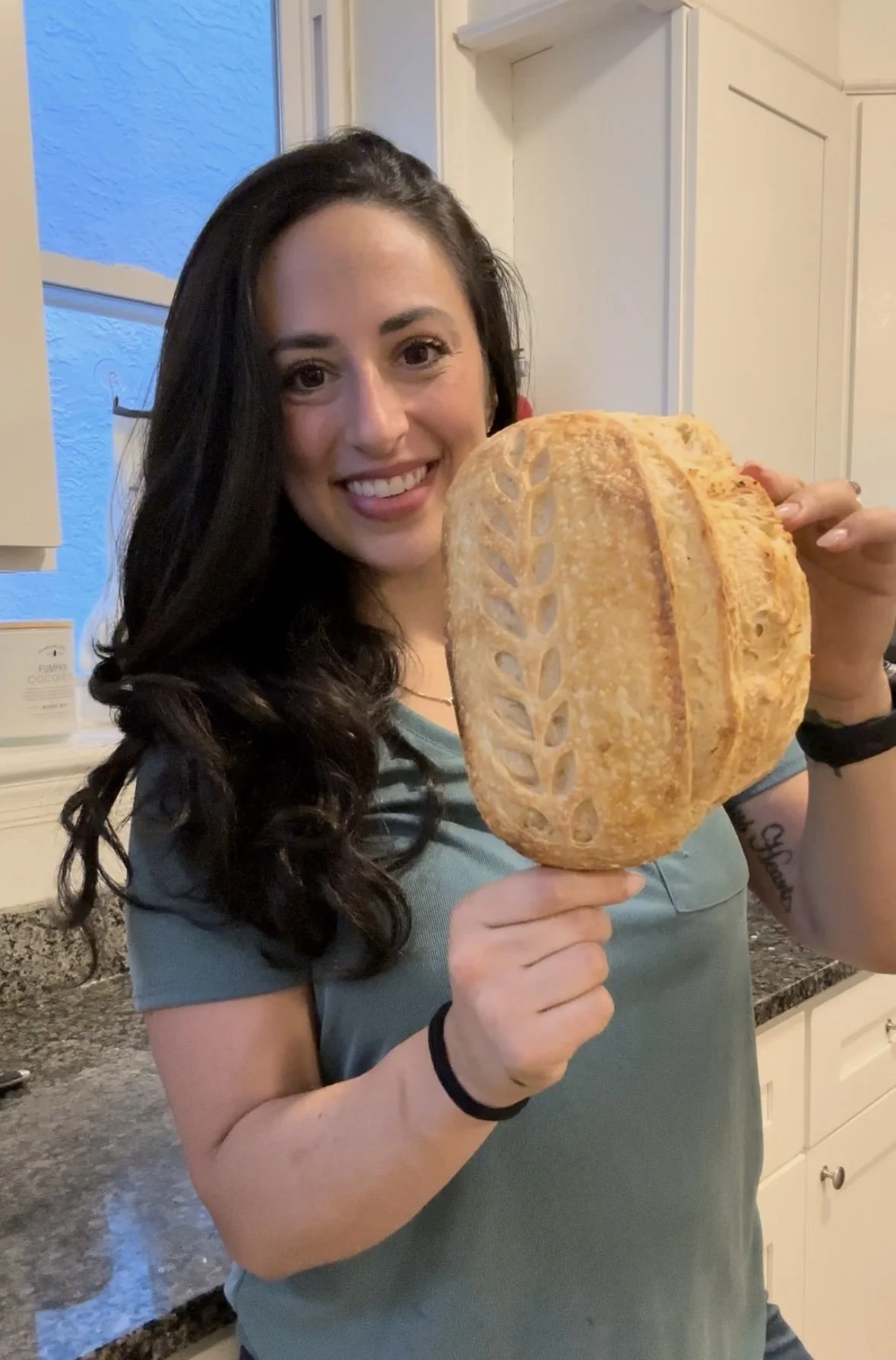 “When I started baking sourdough in April 2023, I was living far away from my friends and family, had a 1 year old son, was due in May with my daughter and had just traumatically lost my dad a few months prior. I was having a hard time keeping up with my pre-motherhood hobbies. I was lonely, heartbroken, and knew I needed something to keep my mind busy. I started seeing bread things come up on my Instagram and I had ABSOLUTELY no clue what made sourdough what it was- so I was very intrigued to figure it out. I had been watching how-to videos on YouTube for about a month and finally decided to try and make my own starter from scratch. At the time I had no idea about the health benefits of sourdough, I didn’t know all the recipes you could make with sourdough discard and I didn’t know baking could be so scientific! I continued baking for my friends and family and after months of people suggesting I start selling my bread I finally did and was just SHOCKED at how many amazing people I’ve been fortunate enough to bake for. “